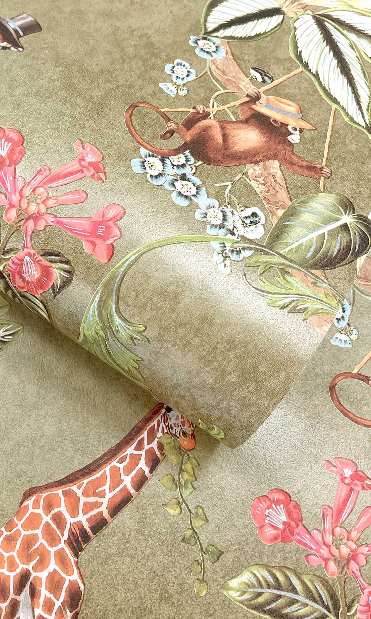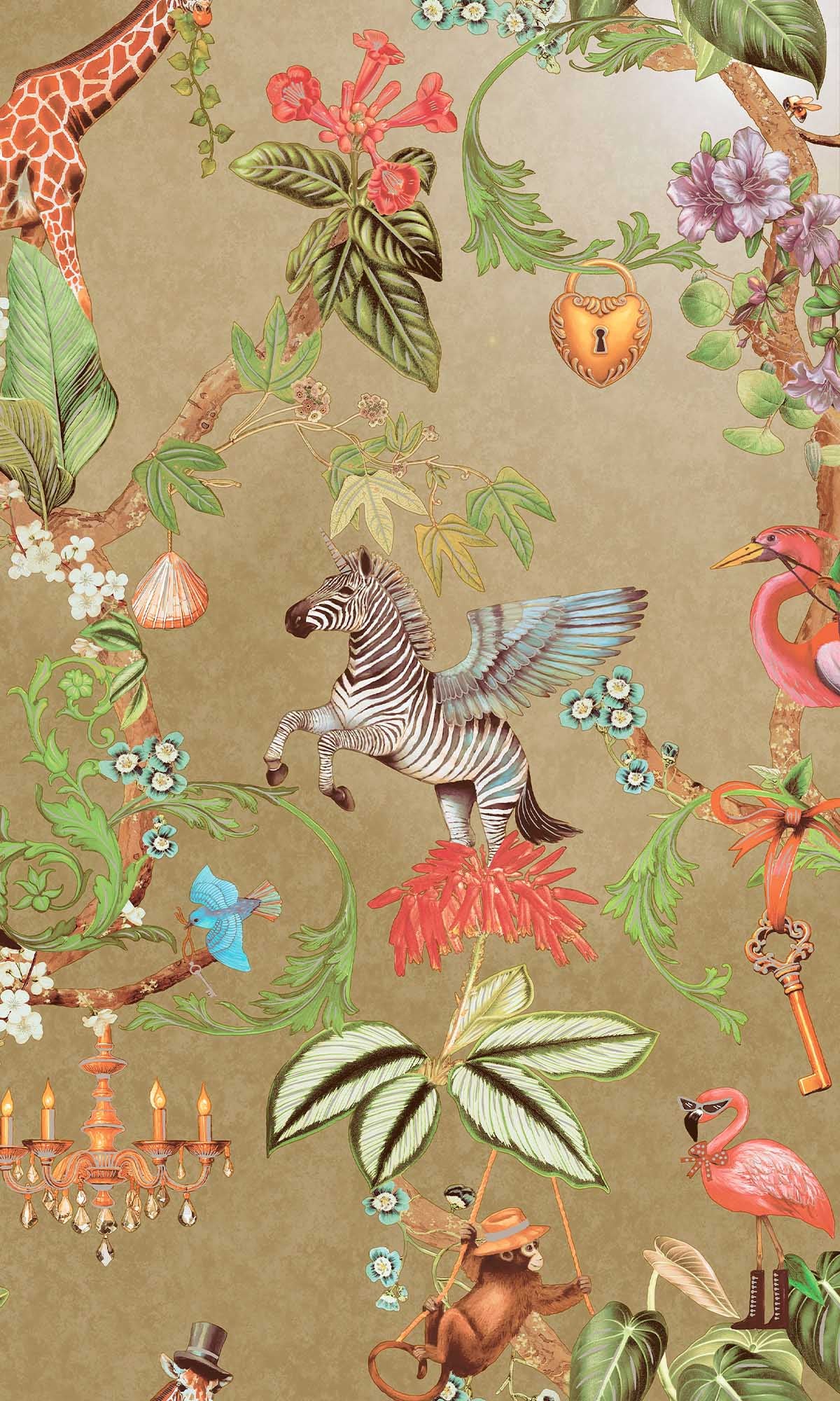 Step into a room adorned with this wallpaper, and it feels like you’ve just been invited to the most vibrant jungle party imaginable—seriously, it’s impossible not to grin. Picture a tiger strumming a violin (yep, you read that correctly), alongside zebras that seem to have jumped straight out of a fairy tale. The entire scene is alive with vivid colors, quirky chandeliers, and flowers that seem to radiate light. And don’t overlook the monkeys hitching rides on the backs of exotic birds, plus delightful little surprises like vintage keys and heart-shaped lockets nestled among the vines.