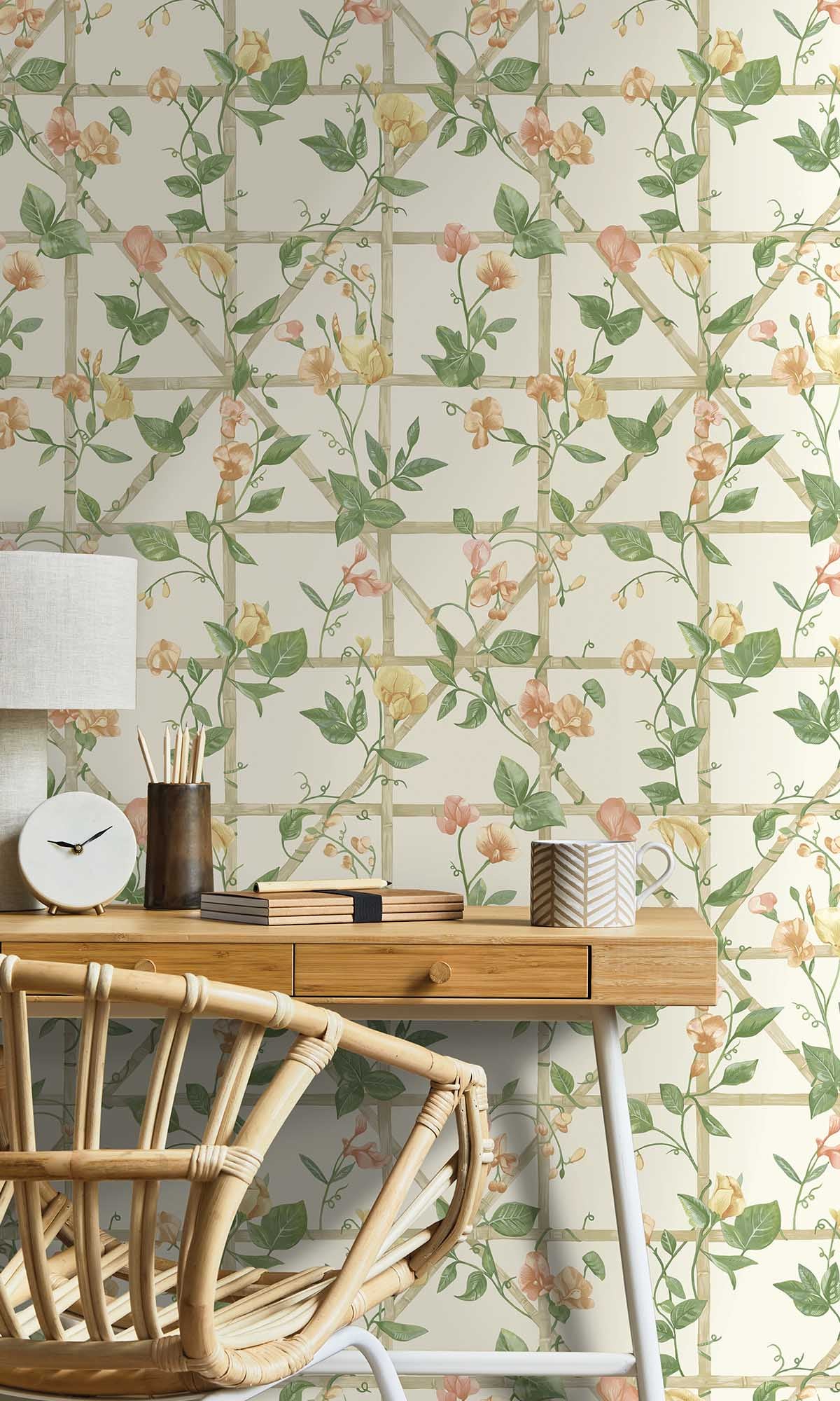 Give your walls an instant refresh with the Trailing Floral Vines Wallpaper. This design brings the charm of an English garden indoors—without the mud or buzzing bees. Featuring a delicate trellis with climbing sweetpeas, the soft, flowing vines and intricately detailed petals create a fresh, romantic, and effortlessly elegant look. Step inside, and your room feels alive, airy, and inviting.