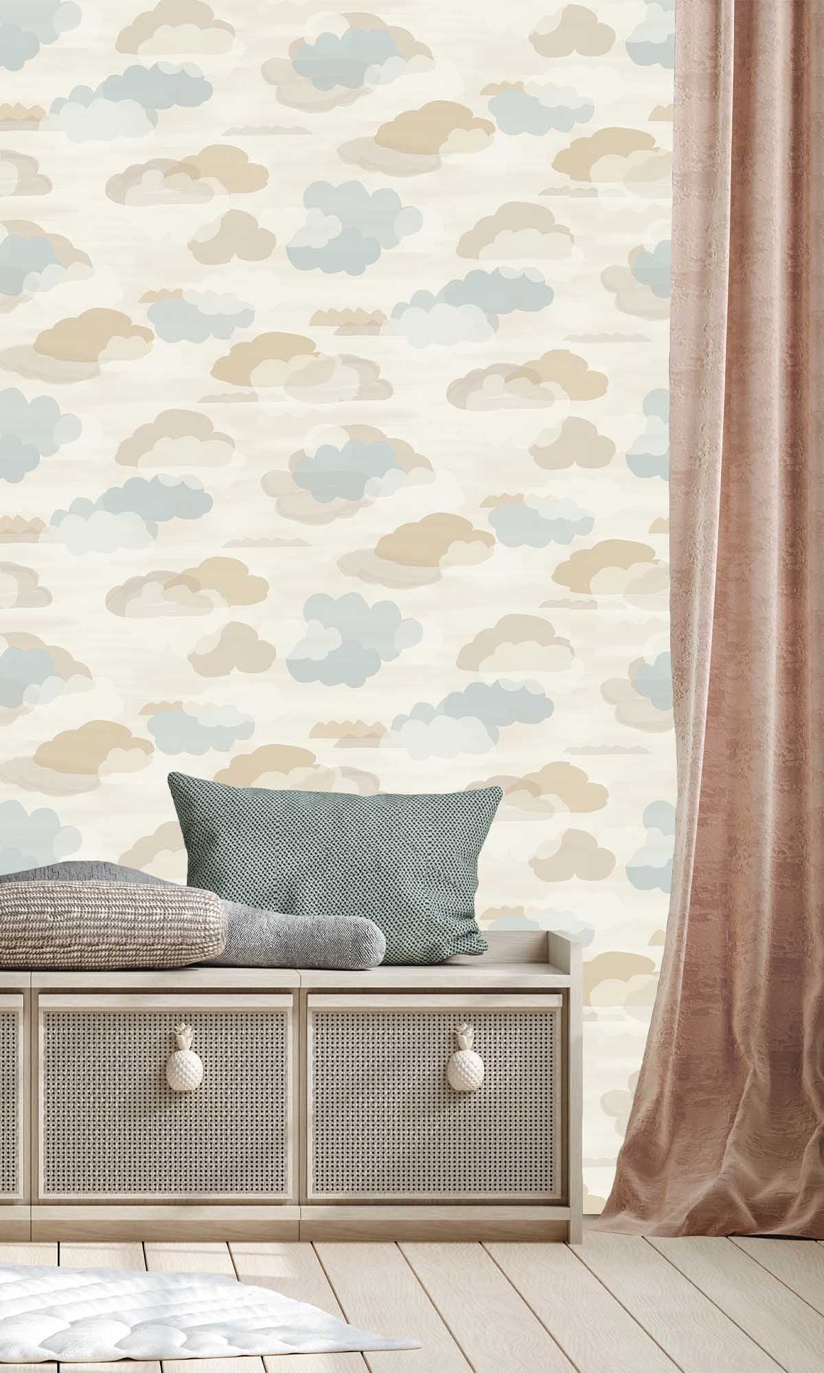 Create a cheerful and uplifting atmosphere with our Little Dreamers Figari Wallpaper, a charming cloud-themed wallpaper designed to brighten any child’s room, nursery, or play space. This delightful pattern features cartoon-like clouds in soft, colorful shades, giving the design a whimsical and dreamy feel. The lightly textured surface adds gentle dimension, making the clouds appear even softer and more playful.