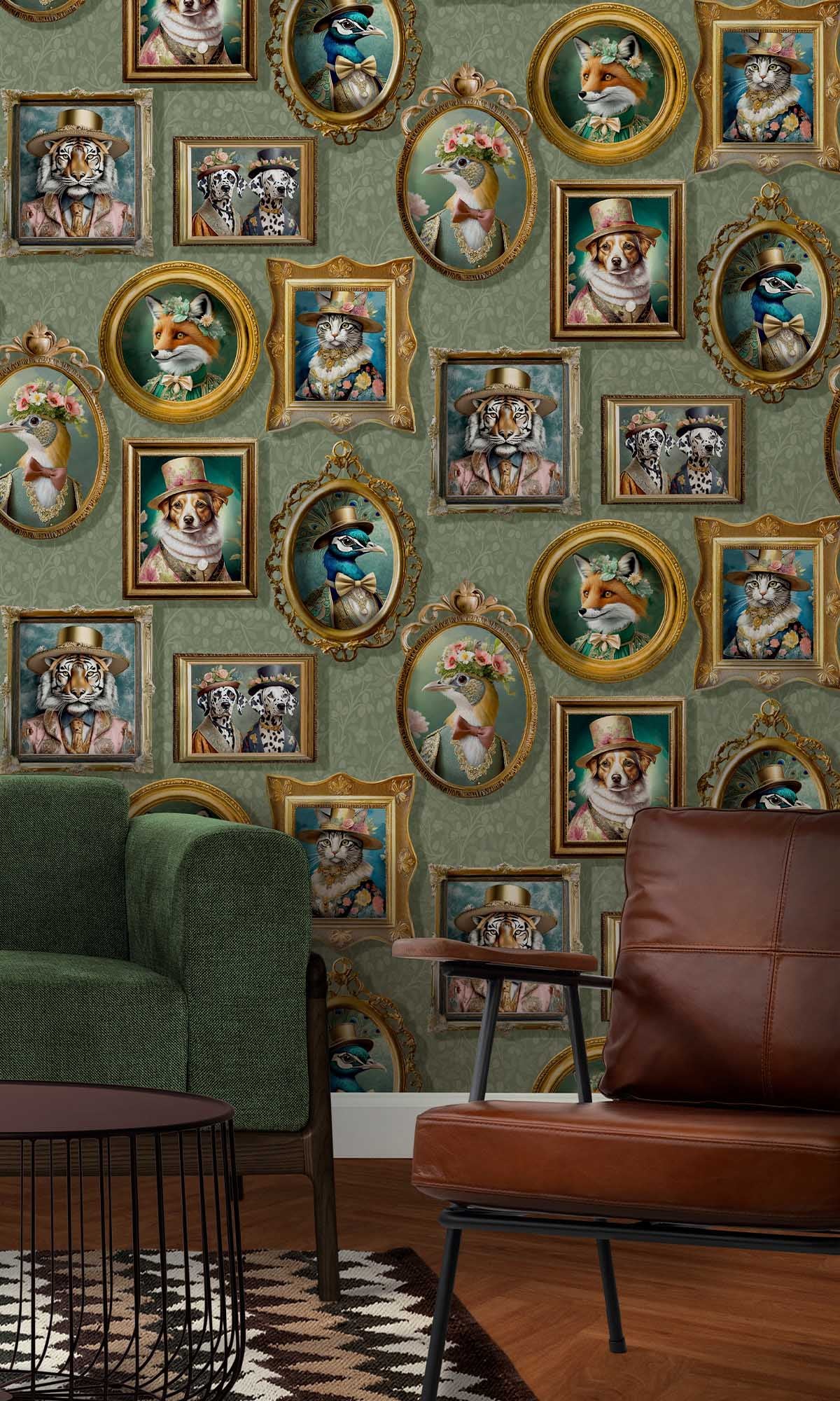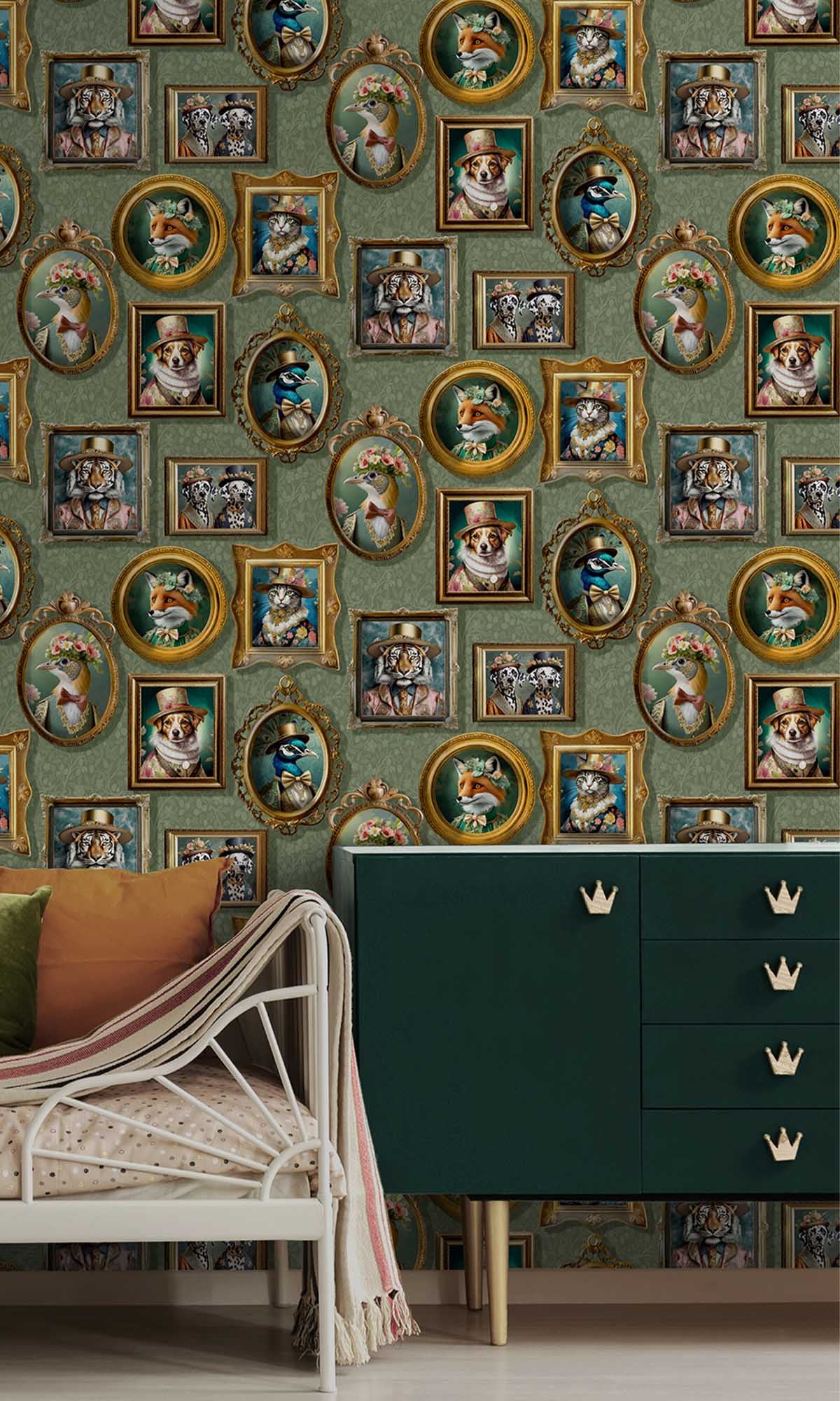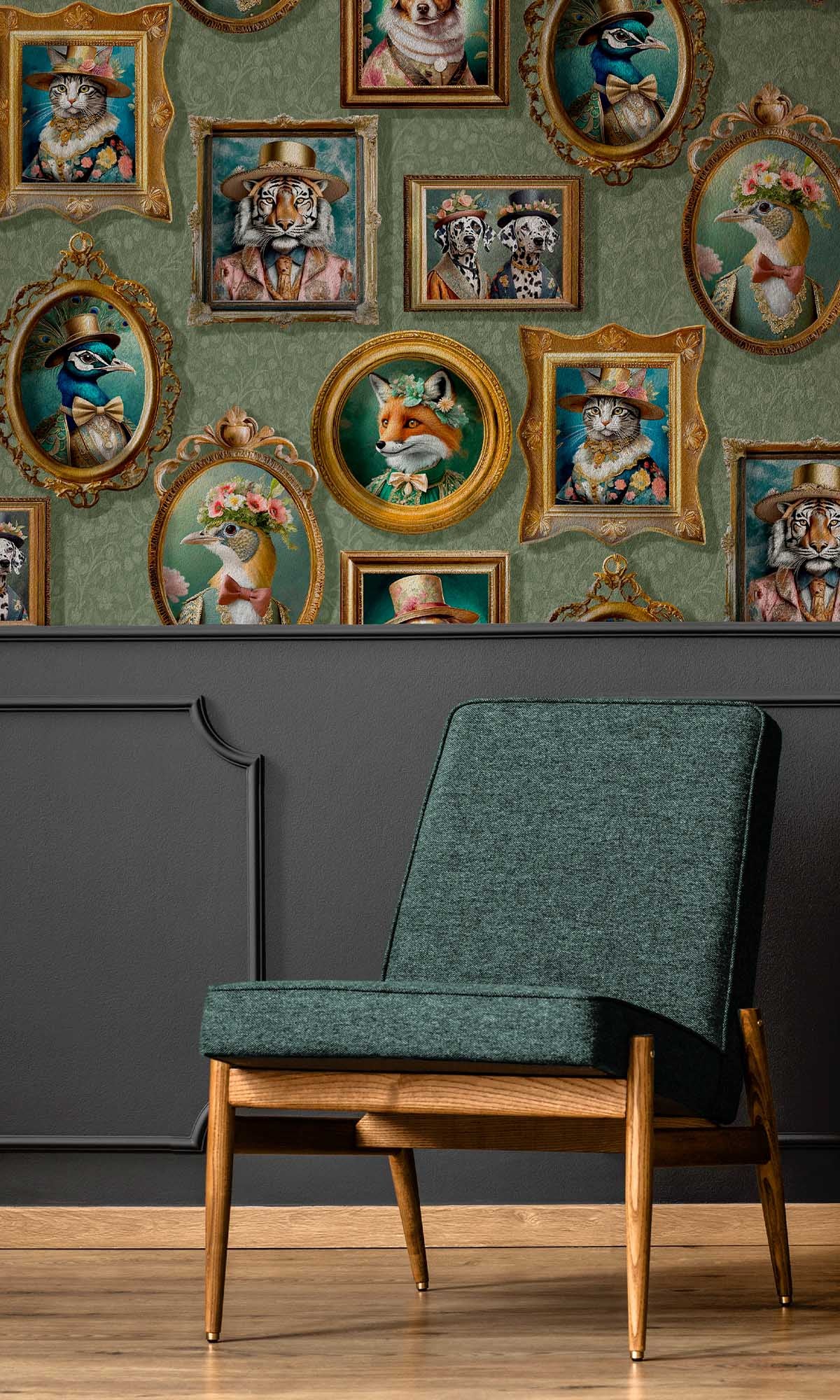 The Framed Regal Beasts Wallpaper is a work of art that transforms your room into a realm of regal wonder. Use it to create a statement wall that honors creativity, style, and narrative.  This unique design, which features picture frames full of adorable animals wearing exquisite Victorian-era clothing, turns any space into a sophisticated gallery of imagination.  From elegant foxes in evening gowns to dapper dogs in top hats, every portrait perfectly combines humor, fantasy, and sophistication.