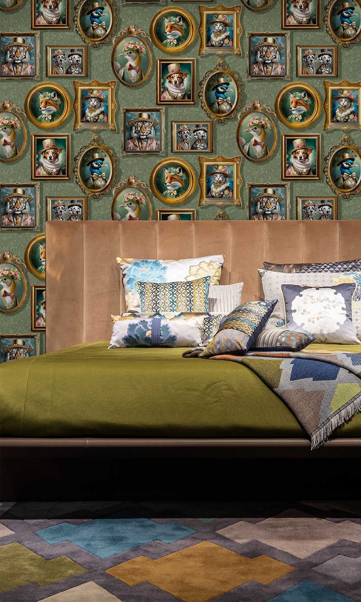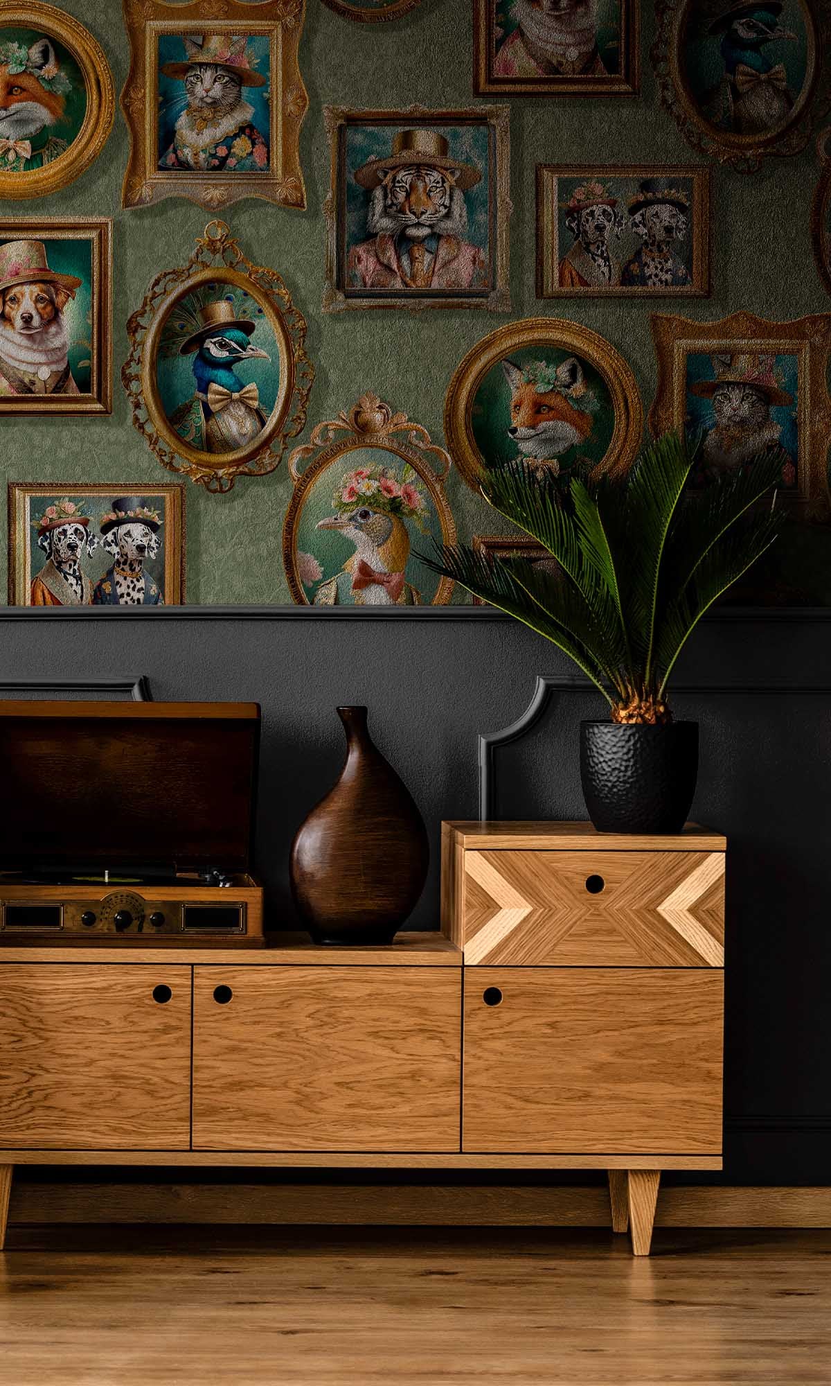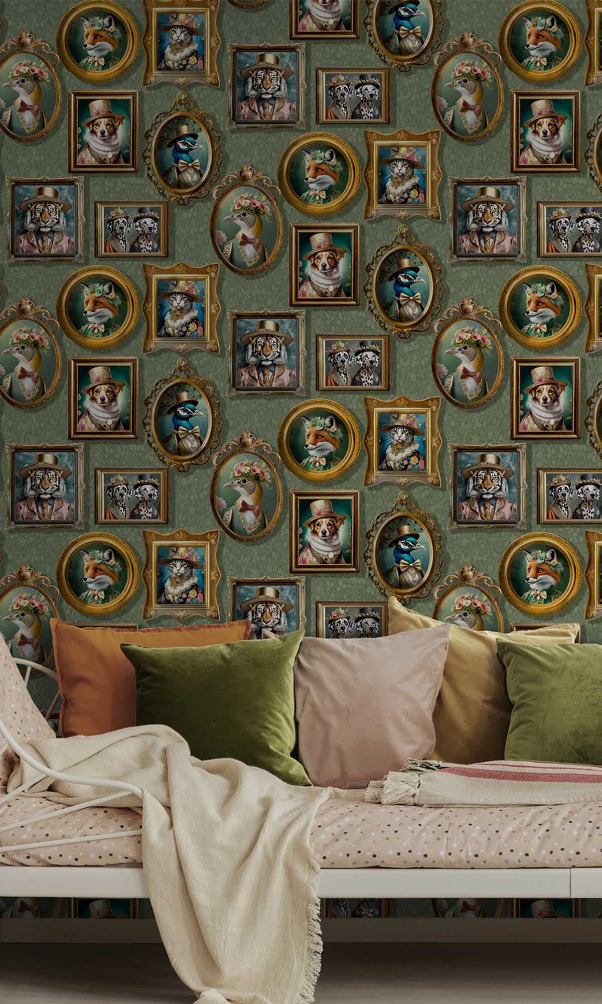 The Framed Regal Beasts Wallpaper is a work of art that transforms your room into a realm of regal wonder. Use it to create a statement wall that honors creativity, style, and narrative.  This unique design, which features picture frames full of adorable animals wearing exquisite Victorian-era clothing, turns any space into a sophisticated gallery of imagination.  From elegant foxes in evening gowns to dapper dogs in top hats, every portrait perfectly combines humor, fantasy, and sophistication.