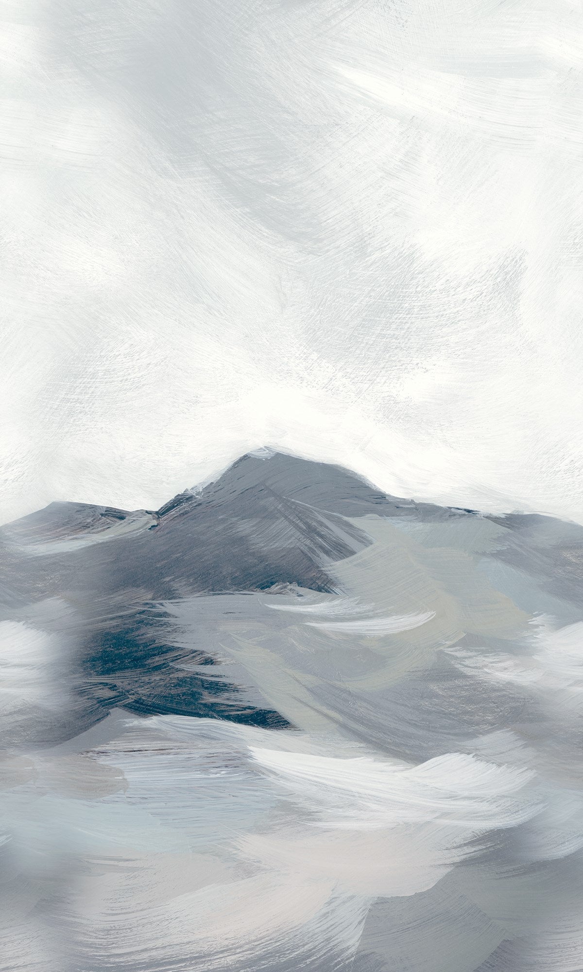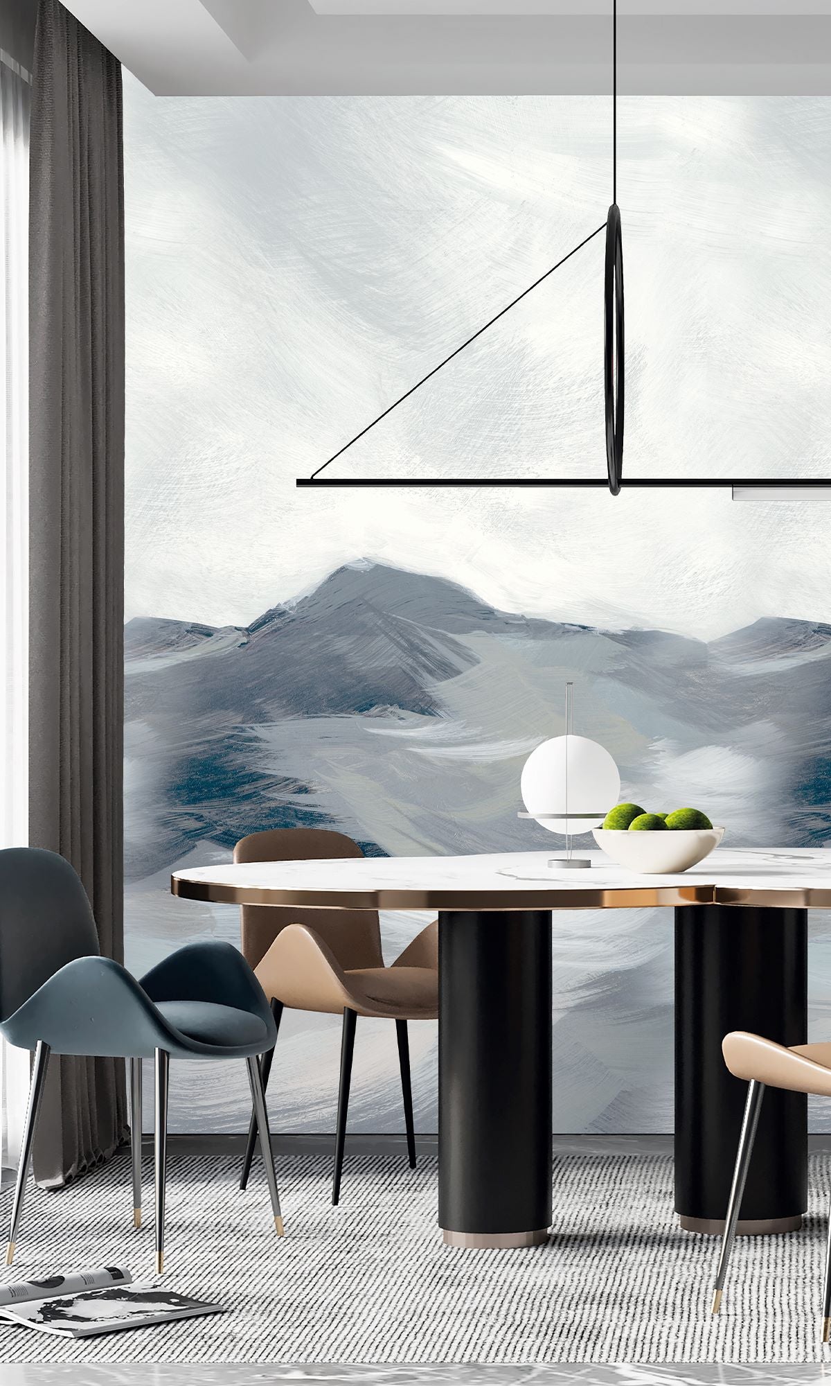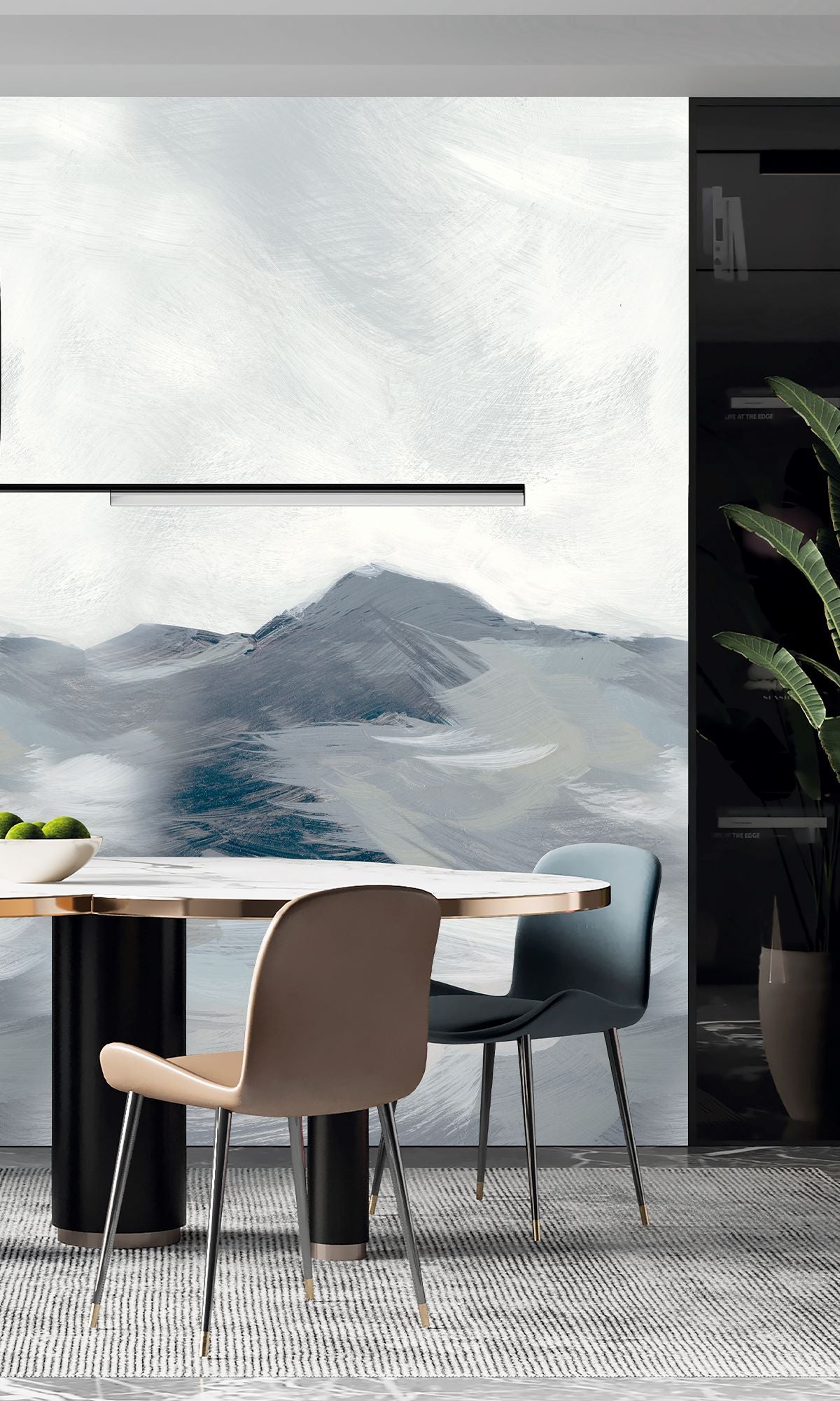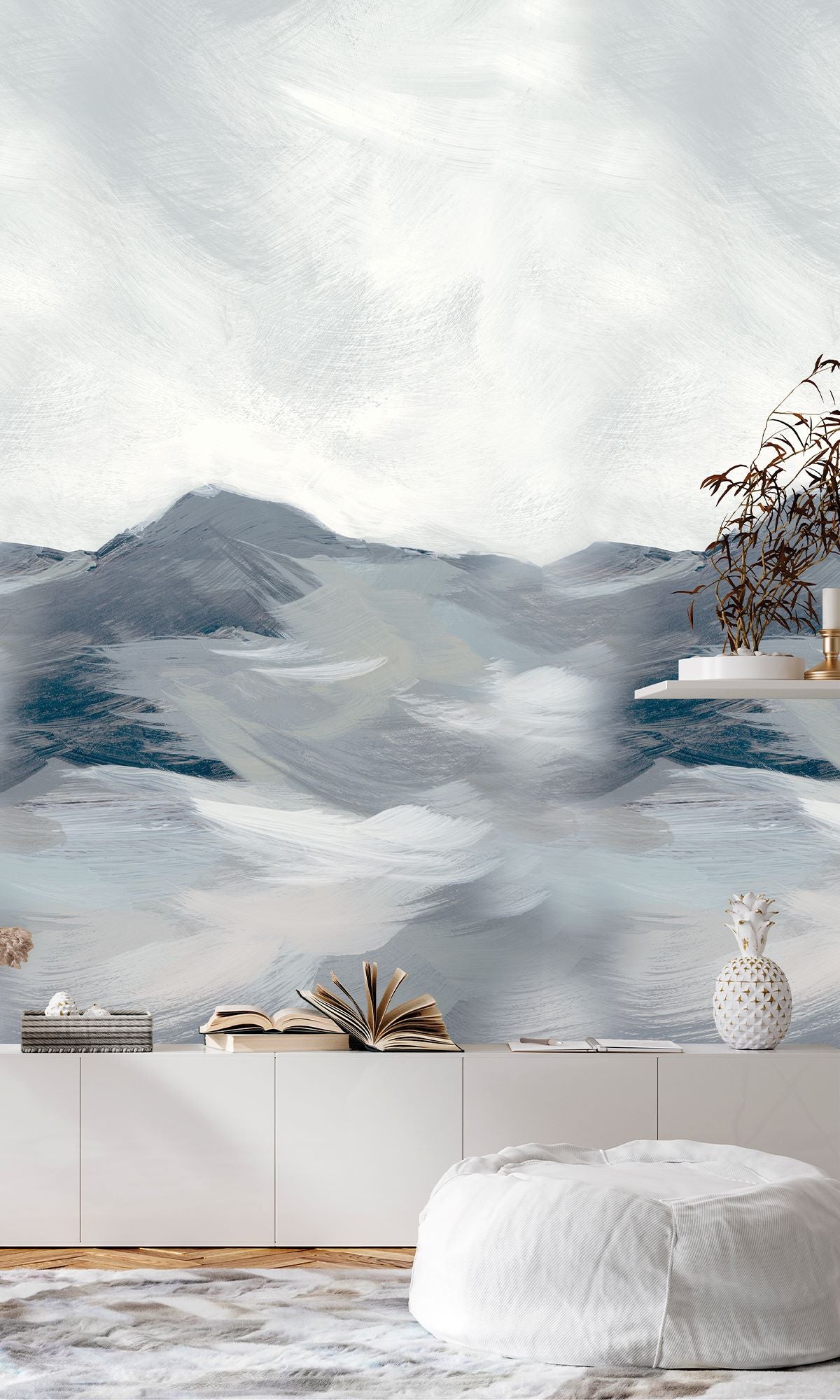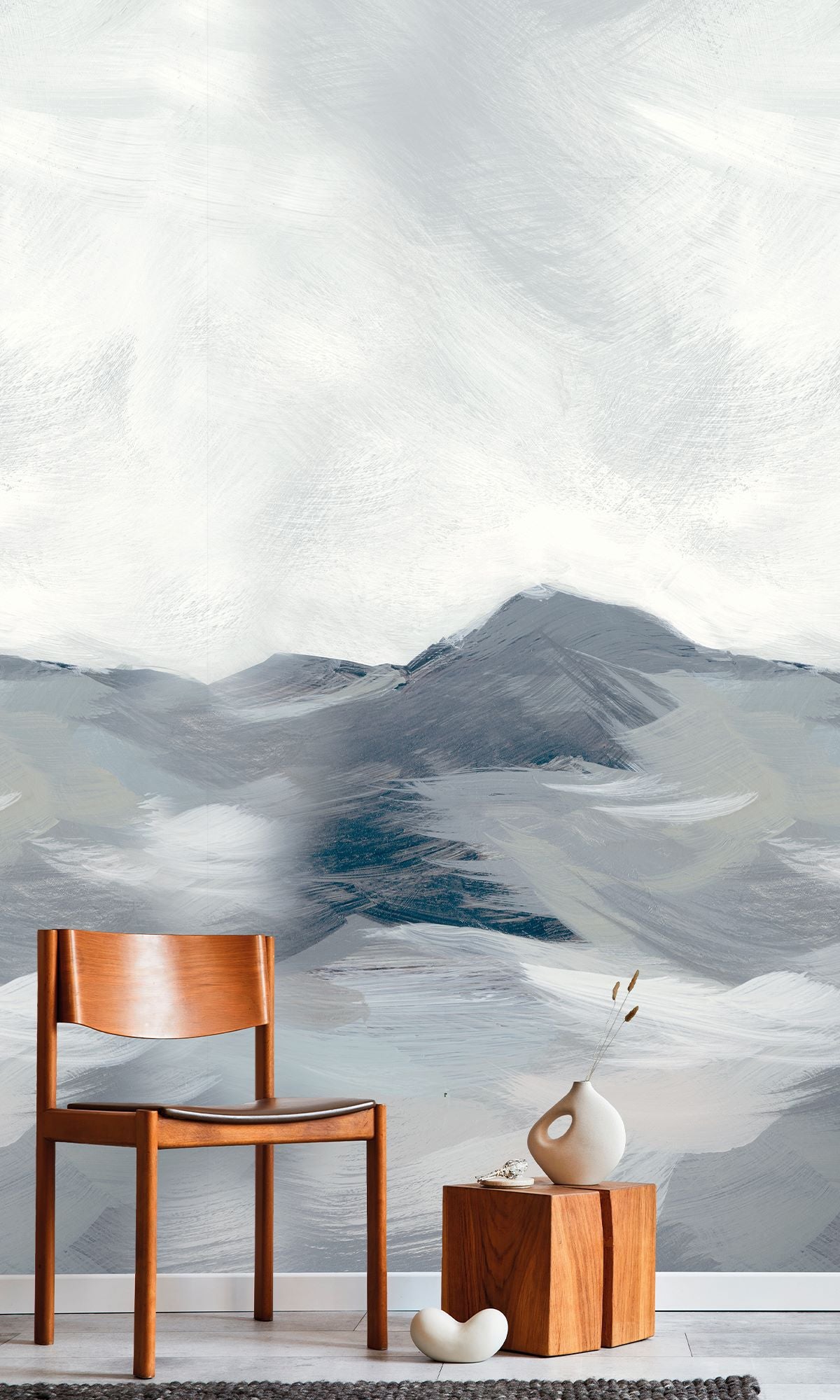 You get these dreamy, layered peaks and ambient swooshiness that almost make you forget you're indoors with this Serenity Elevasion mural wallpaper of a mountain landscape. It's not only artistic; it's like watercolor poetry.